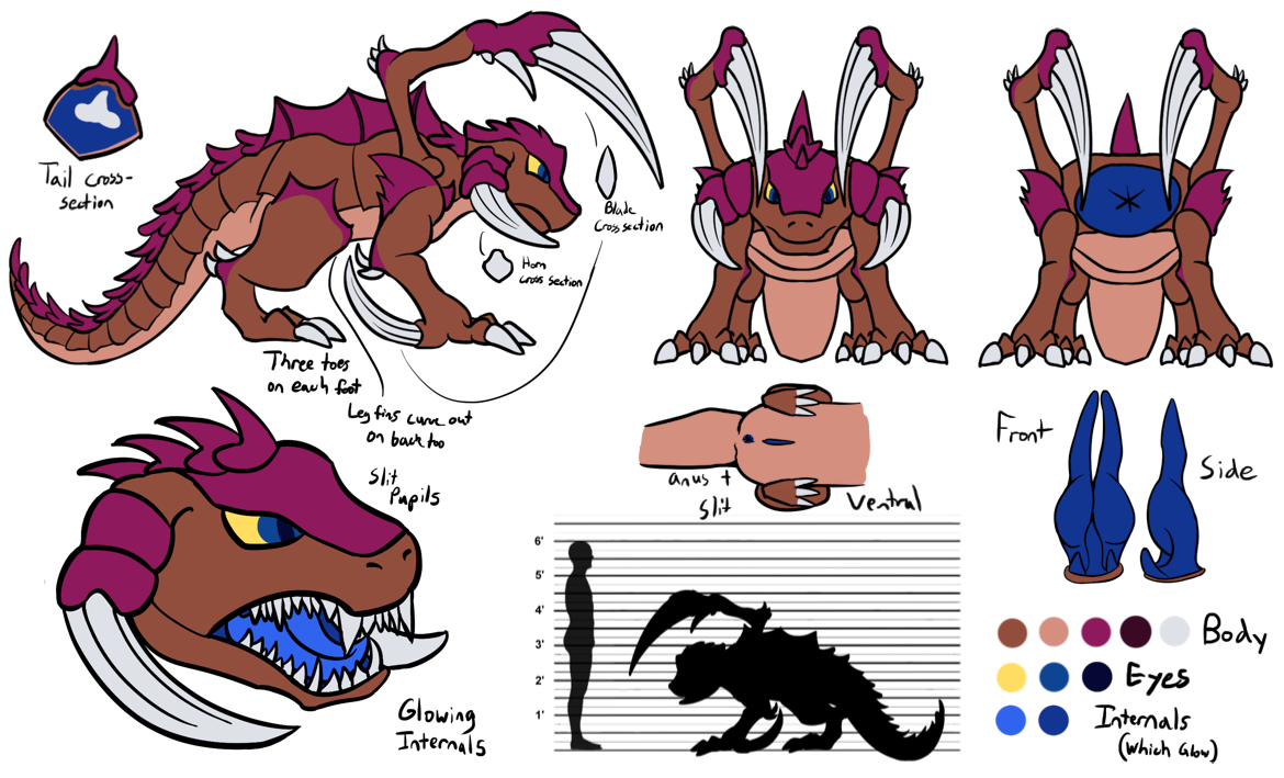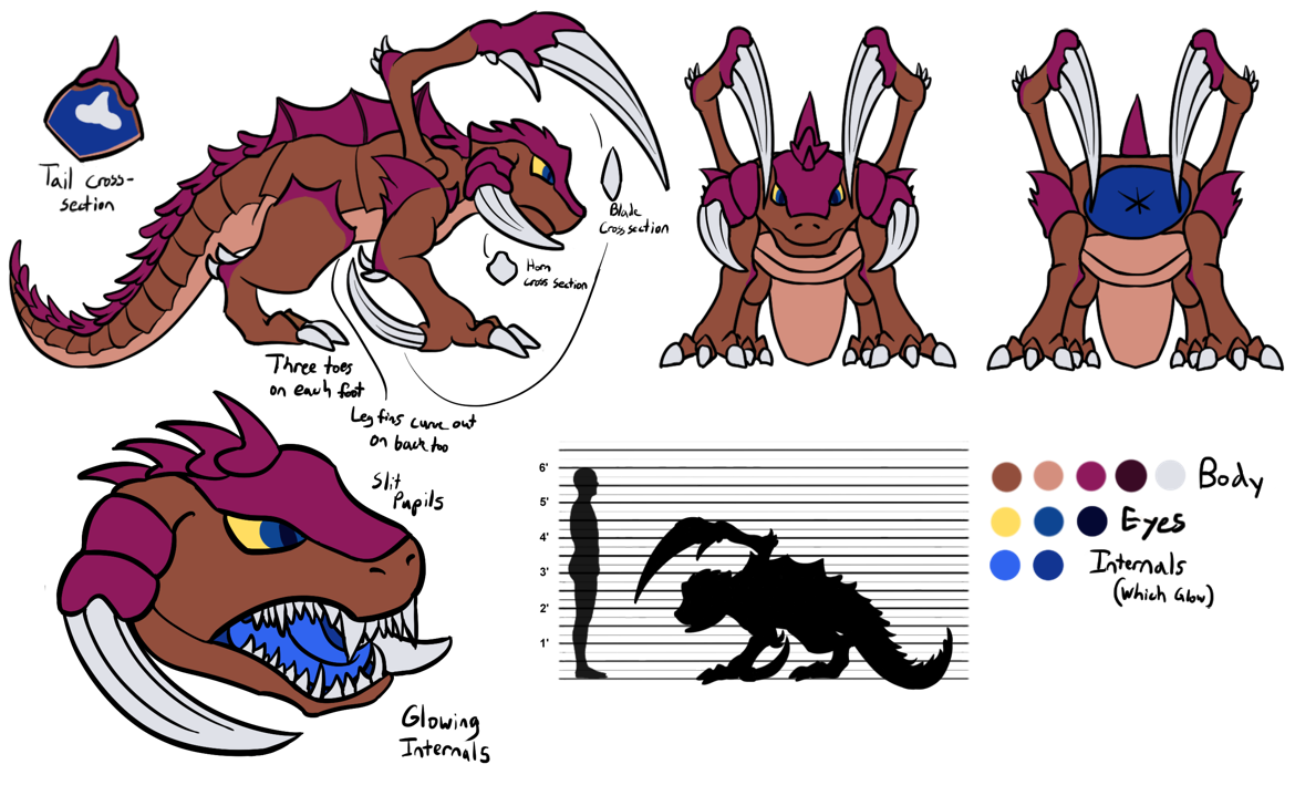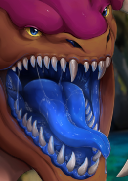 Drythkalt has sharp teeth for ripping and tearing. He has a broad tongue and the flesh on the inside is blue.