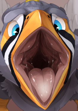 As a gryphon, Ruzzy's digestive system starts with his beak. He has no teeth, but can bite down with the sharp edges. He must make a bobbing motion to swallow. His internal flesh is natural colored.