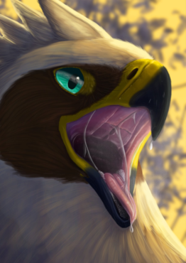 Serilde is a gruff mercenary predator, and as such she's got an appetite to match her active lifestyle. A bird like her can only subsist on meat, and she'll usually go after the criminal elements that she comes up against in her line of work. Ruthless, she will gulp them down to help fuel her work. She's not above hunting when she needs to as well. Sometimes she can be sadistic with her prey when she thinks they deserve it, breaking them down mentally as well as physically for her own pleasure. Overall, she's a very physical hunter.